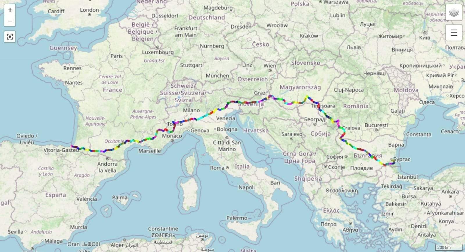 Anouk a assemblé les tracés GPS de notre voyage. Ces dizaines de segments colorés d'une trentaine de km chacun matérialisent notre parcours à travers l'Europe.